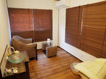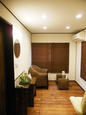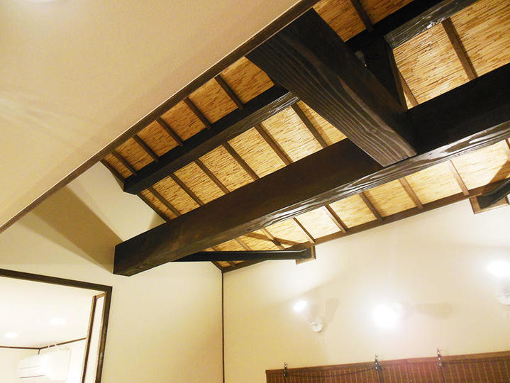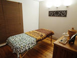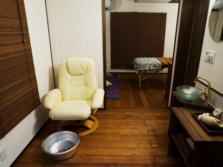 床に赤松の無垢材を使用し、施術ルームの天井は、既存の梁と火打ちをそのまま見せることで、バリ島リゾートの雰囲気を演出しています