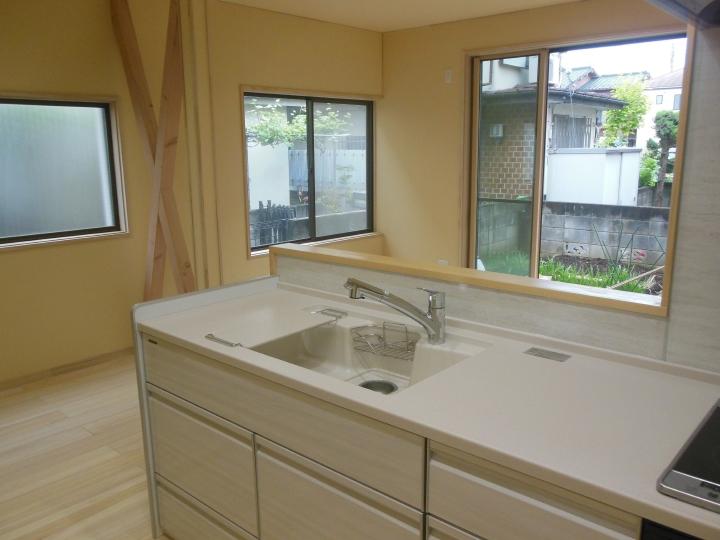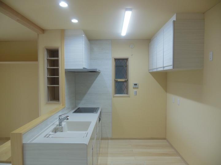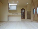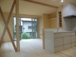 | 和室とダイニング・キッチンに仕切りと段差があり、不便だった。 間仕切りを撤去と段差を解消して対面キッチンのLDKにしたかった。 撤去出来ない耐力壁と柱は表しにすることで視線を遮らず、開放的になりました。 また、補強梁もあえて表すよう天井高を上げて、より広い空間となりました。 |