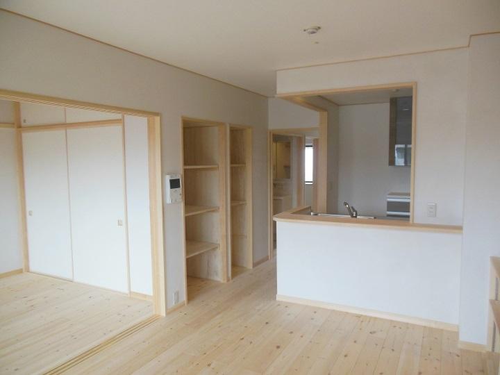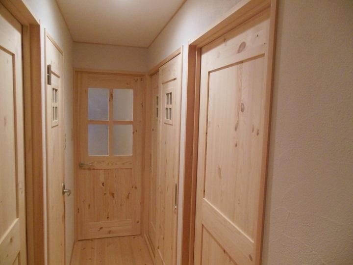 床板・窓枠・建具・棚板等、すべて赤松材。
